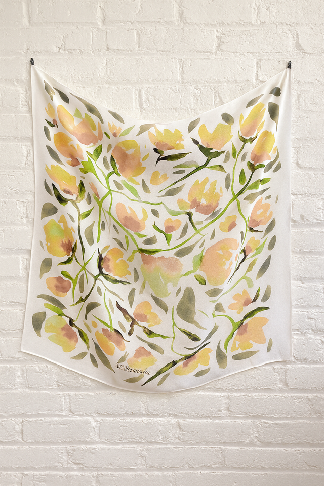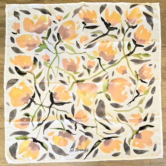 Este pañuelo exclusivo esta realizado en seda lavada de alta calidad, suave al tacto y con una caída fluida que acompaña el movimiento. Su diseño nace de una pintura original en acuarela, donde los matices y transparencias propios de la técnica se traducen en un estampado delicado, artístico y lleno de personalidad.