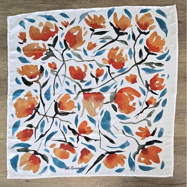 Este pañuelo exclusivo esta realizado en seda lavada de alta calidad, suave al tacto y con una caída fluida que acompaña el movimiento. Su diseño nace de una pintura original en acuarela, donde los matices y transparencias propios de la técnica se traducen en un estampado delicado, artístico y lleno de personalidad.
