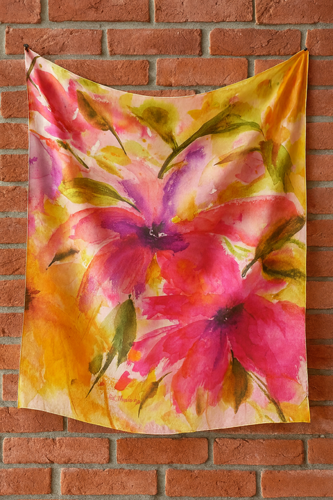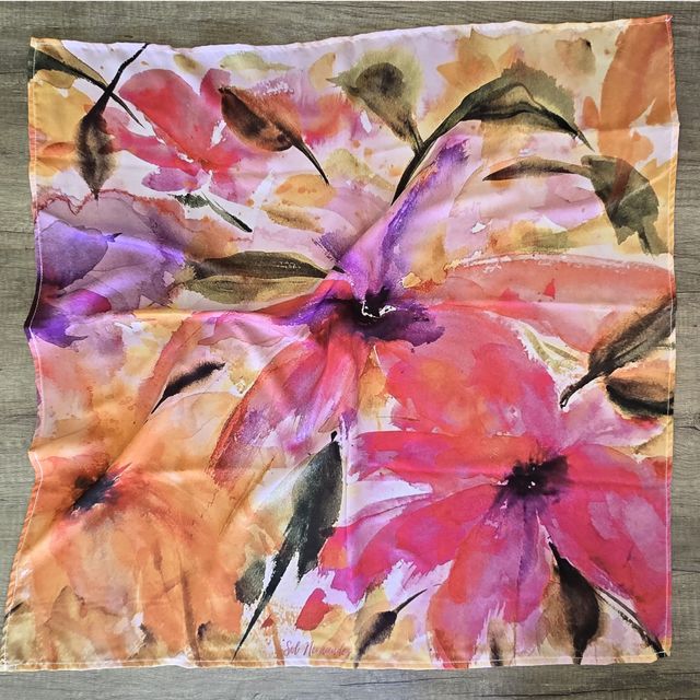 Este pañuelo exclusivo esta realizado en seda lavada de alta calidad, suave al tacto y con una caída fluida que acompaña el movimiento. Su diseño nace de una pintura original en acuarela, donde los matices y transparencias propios de la técnica se traducen en un estampado delicado, artístico y lleno de personalidad.