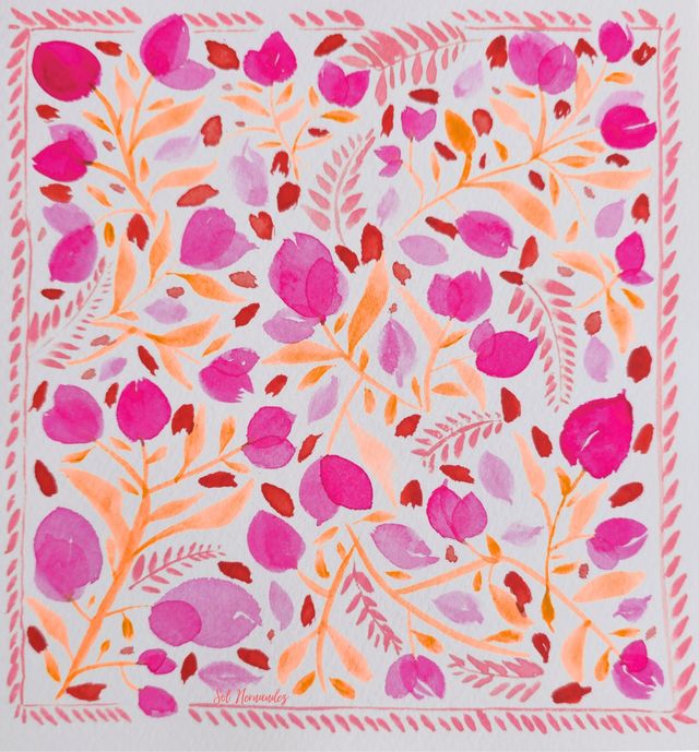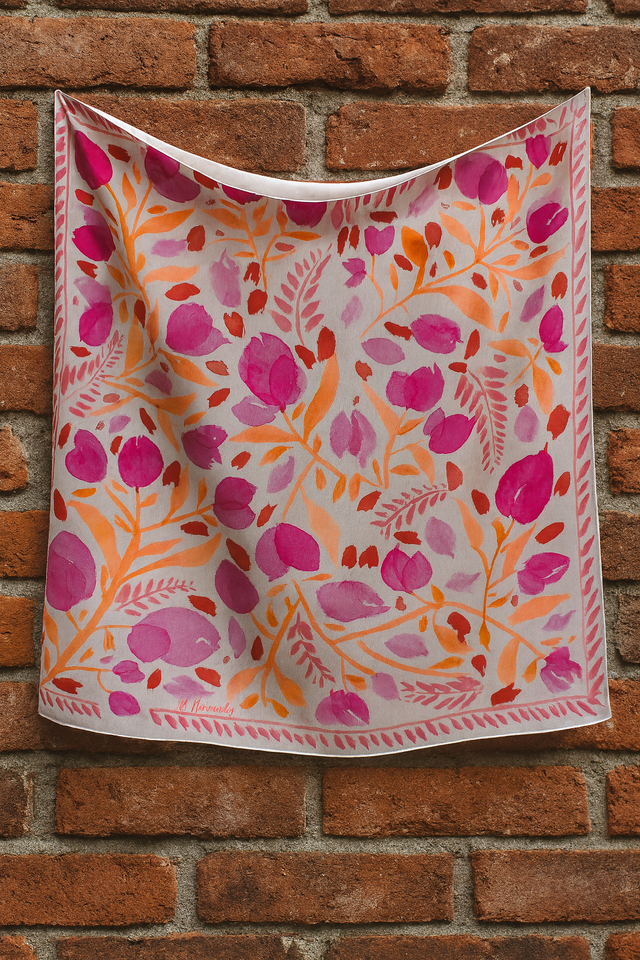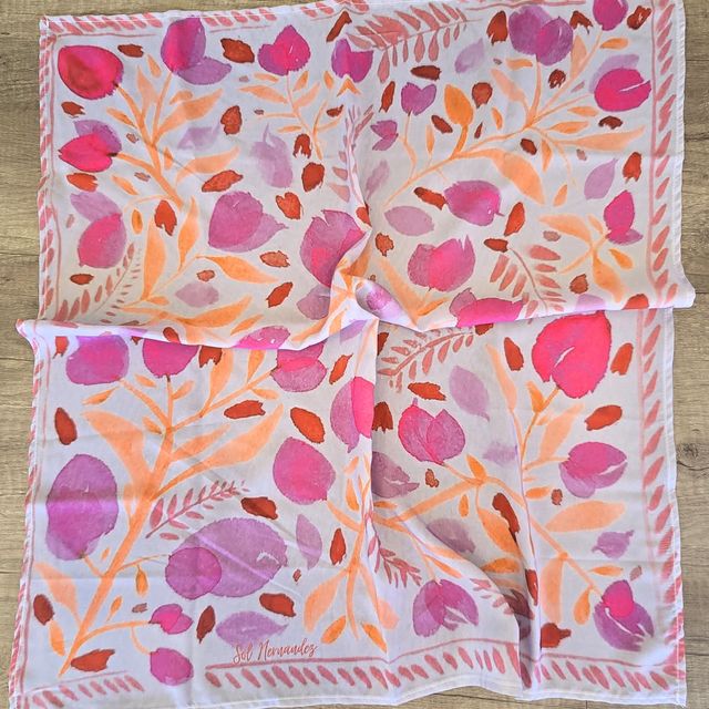 Este pañuelo exclusivo esta realizado en seda lavada de alta calidad, suave al tacto y con una caída fluida que acompaña el movimiento. Su diseño nace de una pintura original en acuarela, donde los matices y transparencias propios de la técnica se traducen en un estampado delicado, artístico y lleno de personalidad.